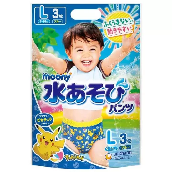 Japońskie pieluchomajtki do kąpieli MOONY, rozmiar L (9–14 kg), dla chłopców, 3 szt. – 4903111116959